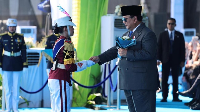 Presiden RI Prabowo Subianto sempat menerima rangkaian bunga dari pasukan Polisi Cilik Tunas Bhayangkara dalam momen Upacara Peringatan Hari Bhayangkara ke-79 di Pelataran Monumen Nasional (Monas), Jakarta. Prabowo pun memberikan pin kenang-kenangan kepada polisi cilik tersebut.