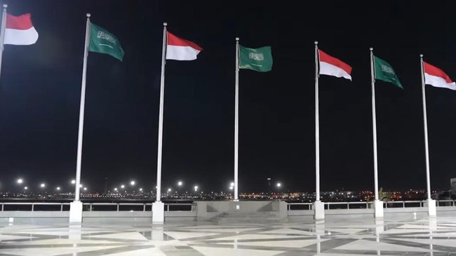 Pantauan detikcom, Selasa (1/7/2025), Bendera Merah Putih dan Arab Saudi sudah terlihat dari Bandara Bandar Udara Internasional King Abdulaziz. Bendera kedua negara dipasang selang-seling.