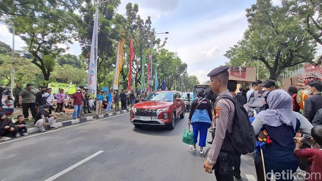 Pantauan detikcom di lokasi, Rabu (2/7/2025) pukul 11.10 WIB, massa buruh memadati pintu masuk Balai Kota Jakarta. Mereka membawa spanduk hingga bendera JRMK.