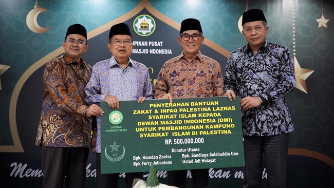 Penyerahan bantuan berlangsung di kantor Pusat DMI. Jakarta, Rabu (2/7/2025). Bantuan diserahkan langsung kepada Wakil Presiden ke-10 dan 12 sekaligus Ketua Umum DMI Jusuf Kalla.