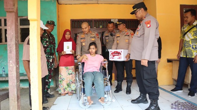 Polres Metro Bekasi menyalurkan bantuan berupa kursi roda untuk warga penyandang disabilitas bernama Bacih (24) di Serang Baru, Kabupaten Bekasi. Warga tersebut mengalami kelumpuhan sejak lahir.