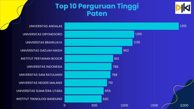 Berdasarkan data DJKI, perguruan tinggi yang menjadi penyumbang paten terbanyak dalam satu dekade belakangan antara lain, Universitas Andalas dengan 1.910 permohonan, Universitas Diponegoro 1.165 permohonan, Universitas Brawijaya 1.136 permohonan, Universitas Gadjah Mada 962 permohonan, Institut Pertanian Bogor 813 permohonan.