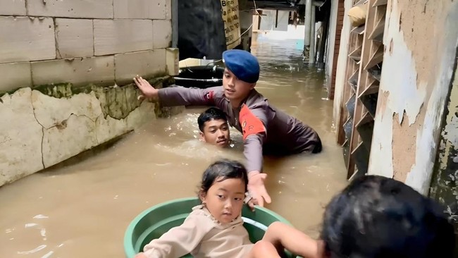 Banjir setinggi 170 cm merendam kawasan Kebon Pala, Kampung Melayu, Jakarta Timur. Satuan Brimob Polda Metro Jaya melalui Tim SAR Batalyon B Pelopor mengevakuasi balita menggunakan ember.