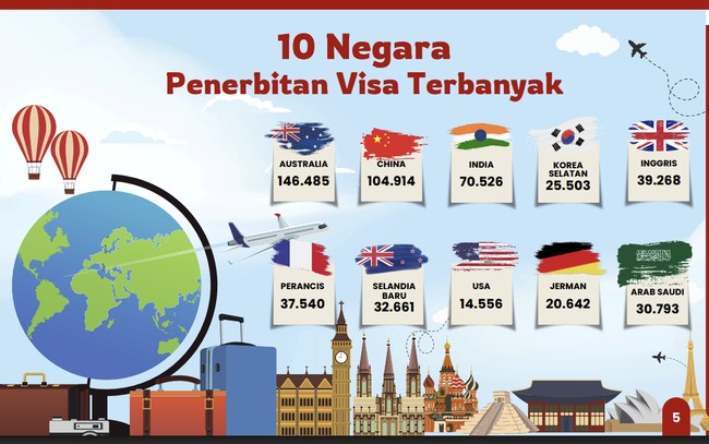 Dilihat detikcom, Jumat (11/7/2025), Direktorat Visa dan Dokumen Perjalanan Ditjen Imigrasi Kementerian Imipas menerbitkan sebanyak 146.485 visa untuk warga Australia. Lalu 104.914 visa untuk warga China serta 70.526 visa untuk India.