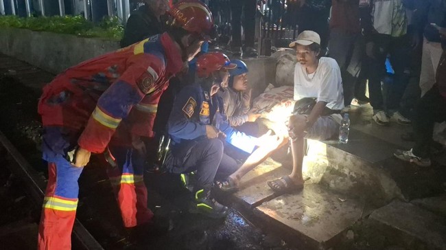 Pantauan detikcom, pria berkaus putih terjepit di rongga antara rel KA dan penutup saluran air atau bak kontrol. Kakinya terjepit hingga sulit dilepaskan.