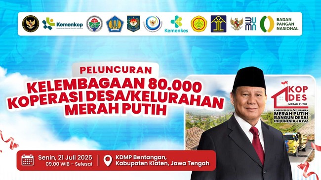 Peluncuran Koperasi Desa/Kelurahan Merah Putih akan dilangsungkan di Koperasi Desa Merah Putih (KDMP) Bentangan, Kecamatan Wonosari, Kabupaten Klaten pada 21 Juli 2025. Prosesi peluncuran juga dapat disaksikan di laman detikcom.