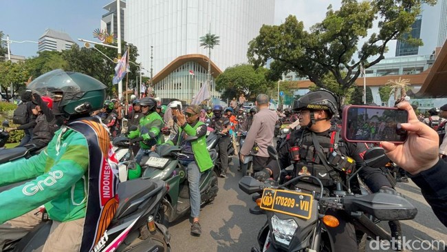 Pengemudi ojek online (ojol) menggelar demo 'Aksi Kebangkitan Jilid II Transportasi Online Nasional 217' hari ini. Jalan Medan Merdeka Selatan dari arah Patung Kuda ke Stasiun Gambir pun ditutup.