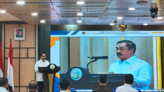 "Dengan pengelolaan rupbasan, Kejaksaan RI diharapkan agar tercipta efektivitas yang lebih tinggi dalam proses eksekusi benda sitaan dan barang rampasan negara," kata Menteri Imipas Agus Andrianto saat acara penyerahan rupbasan di gedung Kejagung, Jakarta Selatan, Selasa (22/7/2025).