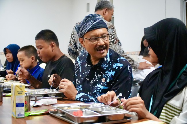 Menteri Sosial Saifullah Yusuf (Gus Ipul) makan malam bersama 93 siswa Sekolah Rakyat Menengah Pertama (SRMP) 10 Bogor, pada Kamis (25/7). Menu yang disajikan sederhana namun bergizi seperti sayur asem, tempe bacem, gulai ayam, semangka, snack, dan susu.