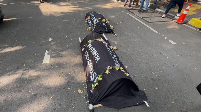 Massa tampak mengenakan baju berwarna hitam. Mereka juga membawa keranda bertuliskan 'matinya demokrasi'.