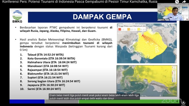 "Sebagai informasi ya, dalam rangka mengantisipasi secara dini potensi tsunami yang akan terjadi, sesuai informasi dari BMKG akibat gempa di Rusia, itu cukup keras dan akan berdampak ke perairan Indonesia, tidak terkecuali di kawasan Teluk Tomini," kata Gusnar dalam keterangannya dilansir detikSulsel, Rabu (30/7/2025).