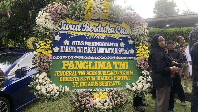 Pantauan detikcom di kompleks TNI AU, Pancoran, Jakarta Selatan, Minggu (3/7/2025), pukul 15.17 WIB, tetangga dan kerabat berdatangan ke kediaman Marsma Fajar. Ada sejumlah karangan bunga yang berjejer di rumah duka salah satunya dari Panglima TNI Jenderal TNI Agus Subiyanto.