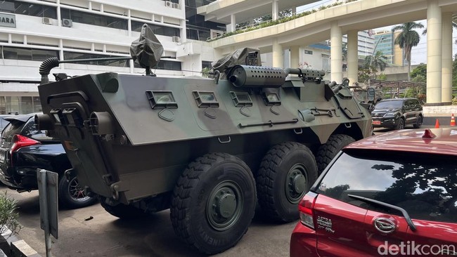 Dua kendaraan lapis baja atau panser TNI jenis Anoa buatan PT Pindad bersiaga di sekitar gedung utama Kejaksaan Agung (Kejagung) di Jakarta Selatan. Kejagung memberikan penjelasan mengenai hal itu.