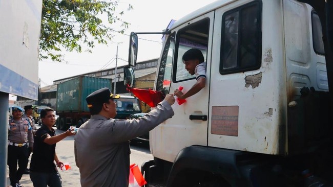 Polres Pelabuhan Tanjung Priok membagikan bendera Merah Putih kepada masyarakat menyambut HUT ke-80 RI. Sebanyak 50 bendera Merah Putih dan air mineral dibagikan kepada masyarakat.