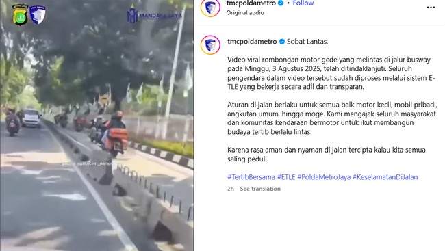 Di caption video tersebut, TMC Polda Metro Jaya menjelaskan rombongan moge tersebut telah ditindaklanjuti. Disebutkan, video viral itu terjadi pada Minggu, 3 Agustus 2025.