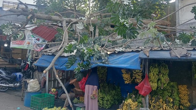 "Pohon tumbang dan menimpa bangunan toko peralatan motor serta kios pedagang pisang di Kelurahan Kebon Kelapa, Kecamatan Bogor Tengah," kata Kalak BPBD Kota Bogor Dimas Tiko, Kamis (7/8/2025).