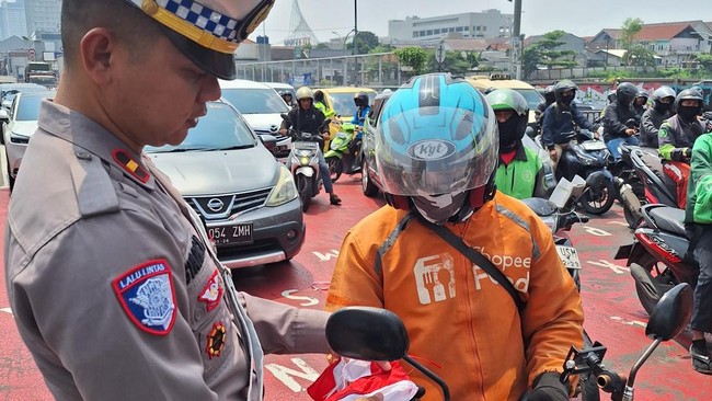 Satlantas Polres Metro Depok melalui Unit Kamsel membagikan bendera Merah Putih dan menyapa pengendara di Jalan Margonda Raya, Depok. Hal itu dilakukan dalam rangka menyambut HUT ke-80 RI.