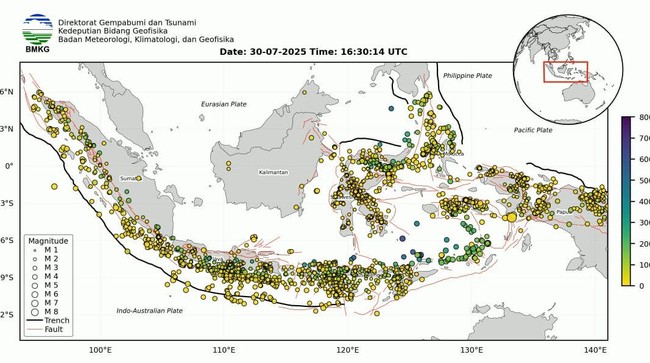 Badan Meteorologi, Klimatologi dan Geofisika (BMKG) mencatat lebih dari 3 ribu gempa terjadi di Indonesia sepanjang bulan Juli 2025. Terdapat 22 gempa dengan kekuatan melebihi magnitudo (M) 5.
