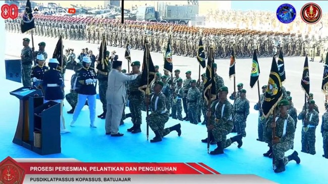 Pelantikan dan pengukuhan dilakukan saat Gelar Pasukan Operasional dan Kehormatan Militer di Batujajar, Bandung, Jawa Barat, Minggu (10/8/2025). Dalam sambutannya, Prabowo menyinggung banyaknya konflik yang terjadi di berbagai wilayah dunia.