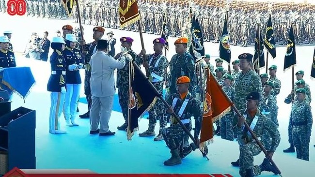 Tiga panglima pasukan elite itu dilantik dalam Upacara Kehormatan Militer di Pusat Pendidikan dan Latihan Pasukan Khusus TNI AD, Batujajar, Bandung Barat, Jawa Barat, Minggu (10/8/2025). Tiga Panglima pasukan elite TNI yang dilantik adalah Komando Pasukan Khusus (Kopassus) TNI AD, Korps Marinir TNI AL, dan Korps Pasukan Gerak Cepat (Kopasgat) TNI AU. Prosesi pelantikan itu ditandai dengan penekan sirine dan penembakan meriam.