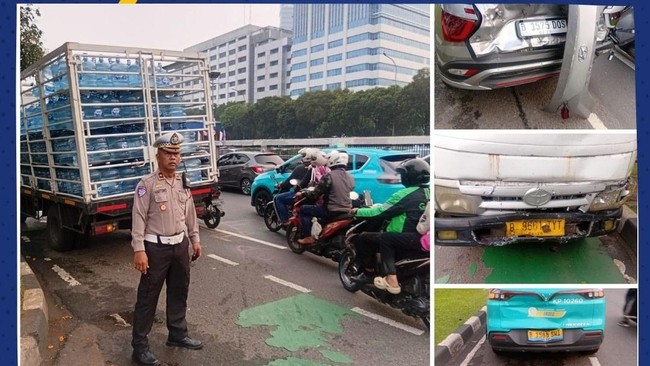 Berdasarkan foto yang diunggah TMC Polda Metro, terlihat 3 kendaraan terlibat kecelakaan, terdiri dari 1 unit truk muatan galon dan 2 mobil. Salah satu mobil terlihat rusak di bagian bodi belakang, sedangkan truk muatan galon tersebut rusak di bagian depan.