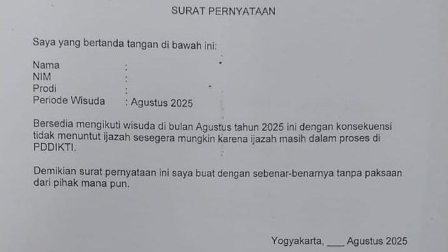 Dalam surat pernyataan itu, seperti dilansir dari detikJogja pada Selasa (12/8), calon wisudawan diminta mengisi nama, nomor induk mahasiswa (NIM), dan program studi.