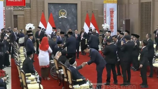Presiden ke-6 RI Susilo Bambang Yudhoyono (SBY) menghadiri sidang tahunan MPR 2025. SBY menyalami Wapres ke-6 RI Try Sutrisno hingga Presiden ke-7 Joko Widodo (Jokowi) yang juga menghadiri sidang tahunan MPR.
