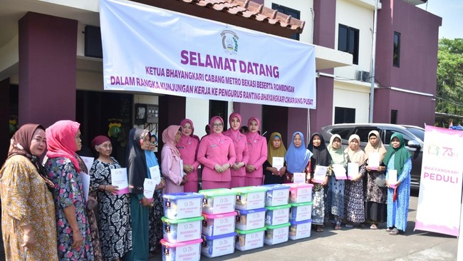 Ketua Bhayangkari Cabang Bekasi, Yanti Mustofa memberikan bantuan untuk kaum duafa di Cikarang, Kabupaten Bekasi. Bantuan diberikan sebagai bentuk kepedulian Polri untuk masyarakat.