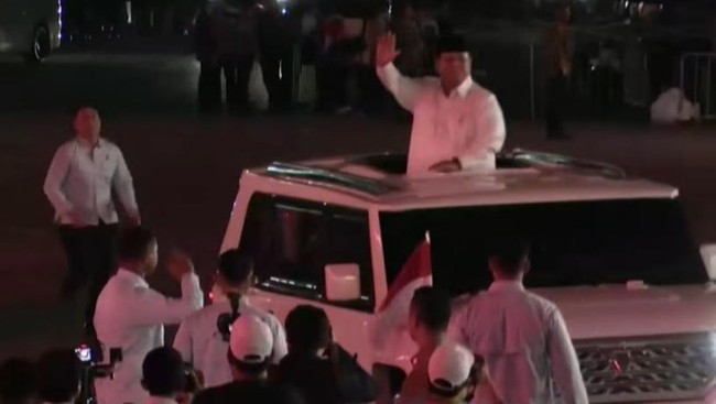 Saat tiba, Prabowo tampak berdiri di atas sunroof maung putih. Prabowo lalu menyapa masyarakat yang sudah memenuhi area panggung karnaval.