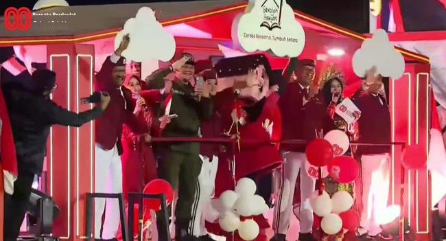 Karnaval peringatan hari kemerdekaan Indonesia yang ke-80 dimulai. Menteri-menteri Kabinet Indonesia bersatu tampak menaiki mobil hias dari kementerian masing-masing.