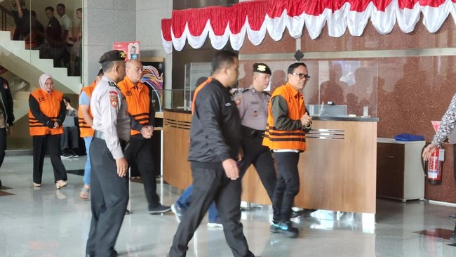 Mereka tampak telah mengenakan rompi tahanan KPK berwarna oranye. Mereka digiring sejumlah pegawai KPK menuju ruang konferensi pers. Selain itu, tangan para tersangka itu juga diborgol.