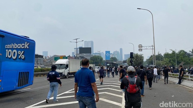 Pantauan detikcom di lokasi pukul 12.45 WIB, massa merangsek masuk ke ruas jalan Tol Dalkot, tepatnya di depan gedung DPR. Kendaraan yang mengarah ke Slipi terhambat.