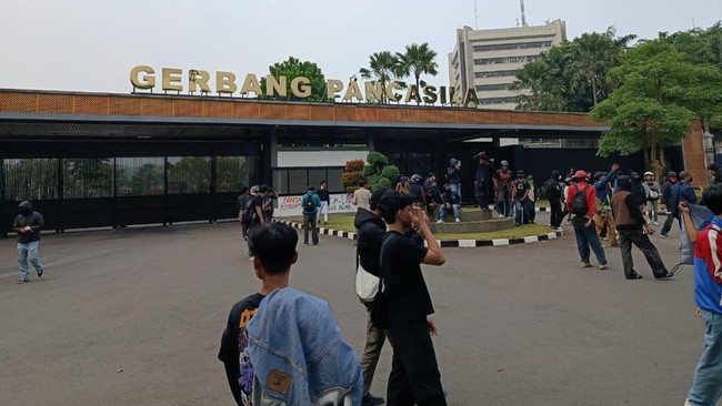 Setibanya di Gerbang Pancasila, massa langsung menggoyangkan pagar meminta masuk gedung DPR RI. Mereka juga membentangkan bendera one piece hingga mencoret coret gedung DPR.