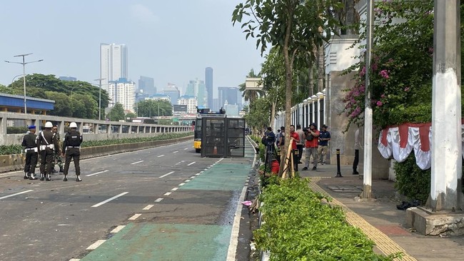 Kondisi lalin Jalan Gatot Subroto arah Slipi masih ditutup. Polisi dan TNI juga masih berjaga di lokasi.