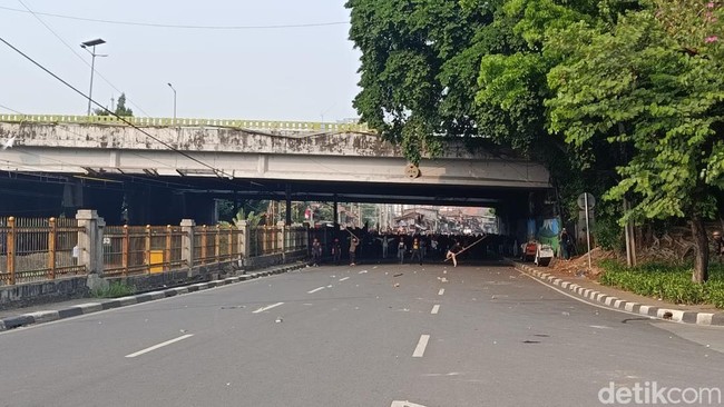 Pantauan detikcom, Senin (25/8), terlihat massa memenuhi Jalan Pejompongan Raya, tepatnya kolong flyover Palmerah. Mereka sesekali melempar batu hingga botol kaca ke arah petugas.