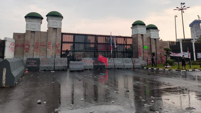 Selain itu, coretan Pilox banyak terlihat di dinding-dinding gedung DPR RI. Sejumlah fasilitas umum tampak rusak, seperti pagar, halte, hingga CCTV di sekitar lokasi.