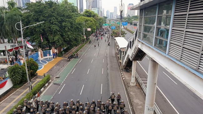 Massa juga masih bertahan di Jalan Gatot Subroto arah Cawang. Massa tepatnya berada dekat Park Royal.