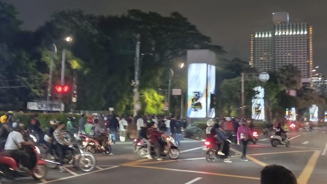 Massa aksi demo 28 Agustus dari kelompok pelajar masih bertahan di Jalan Asia Afrika hingga malam ini. Polisi masih berupaya mendorong massa mundur.