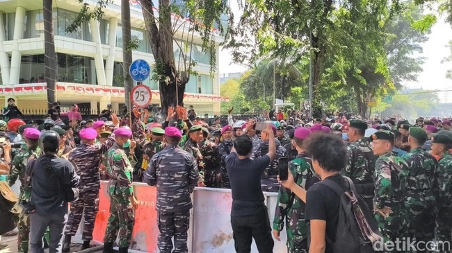 Aksi unjuk rasa di depan Markas Komando (Mako) Satuan Brimob Polda Metro Jaya, Kwitang, Jakarta Pusat, masih berlangsung hingga saat ini. Sejumlah personel Marinir pun mencoba ikut menghampiri massa aksi untuk membuat tenang.
