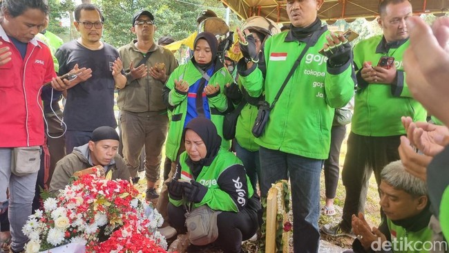 Pantauan detikcom di TPU Karet Bivak, Jakarta Pusat, Jumat (29/8/2026) sejumlah rekan ojol mendoakan Affan di samping pusara. Mereka tampak khusyuk dan beberapa terlihat menitikan air mata.