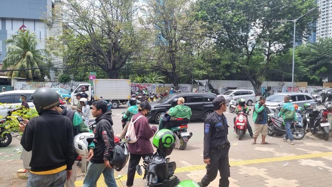 Lautan ojol yang awalnya memenuhi kawasan TPU Karet Bivak mulai surut. Mereka mulai membawa motornya masing-masing keluar dari kawasan itu.