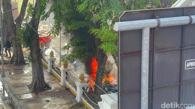 Massa juga melempar petasan hingga membakar motor yang terparkir di dalam gedung. Hal ini menimbulkan asap hitam yang membubung tinggi di lokasi.