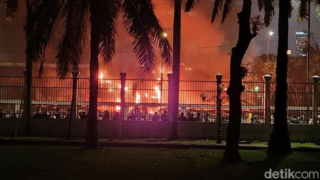 Situasi demonstrasi di sekitar gedung DPR RI, Jalan Gatot Subroto, malam ini memanas. Gerbang Tol Pejompongan arah Cawang dibakar massa.