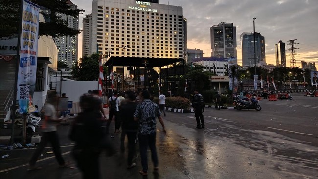 Pantauan detikcom, Sabtu (30/8) pukul 05.30 WIB, lemparan petasan hingga batu masih terus dilakukan ke arah Polda Metro Jaya. Rentetan bunyi ledakan pun terdengar pagi ini.