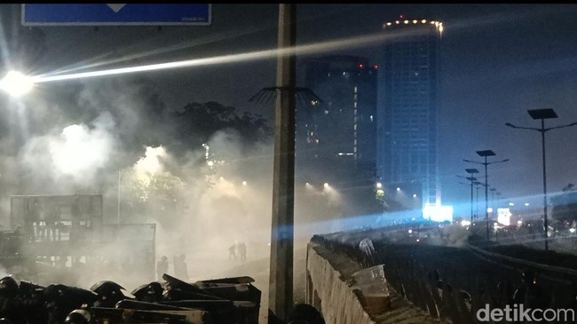 Massa sesekali melempar petasan ke arah atas maupun ke arah barikade polisi. Ada juga massa yang masuk hingga ke Tol Dalam Kota.