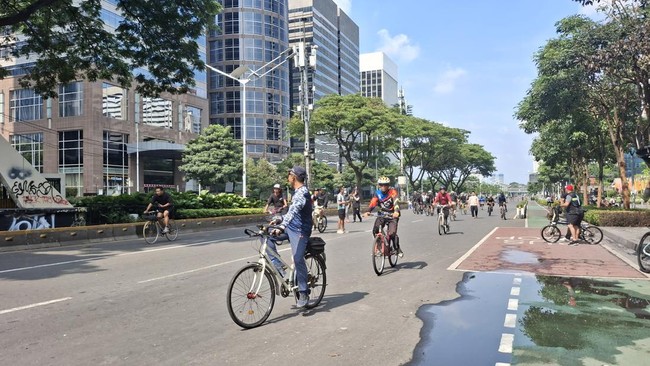 Pantauan detikcom di Jalan Sudirman, Jakarta Pusat, Minggu (31/8/2025), tampak warga bersepeda, lari, ataupun sekadar jalan-jalan bersama keluarga di area CFD.