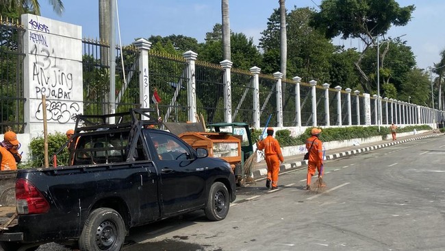 Pasukan oranye juga tampak memperbaiki tanaman yang rusak akibat kericuhan di sekitar gedung DPR tersebut. Jalan Gatot Subroto arah Slipi sendiri masih ditutup untuk proses pembersihan. Ada truk penyapu jalan yang dikerahkan.