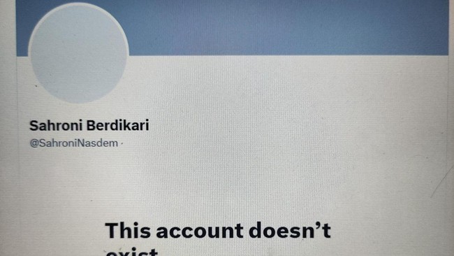 Pada pukul 12.57 WIB, ketika dicari, akun itu sudah tidak dapat ditemukan. Ada tulisan 'this account doesn't exist' ketika dicari. Foto Ahmad Sahroni yang ada di akun itu juga sudah hilang.