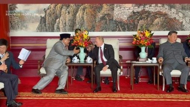 Prabowo, yang memakai setelan jas abu-abu, tampak duduk di sebelah Putin yang juga menghadiri parade militer China. Di sebelah Putin, terlihat Presiden China Xi Jinping duduk di kursi. Tampak Prabowo dan Putin terlihat dengan gestur saling berbincang.
