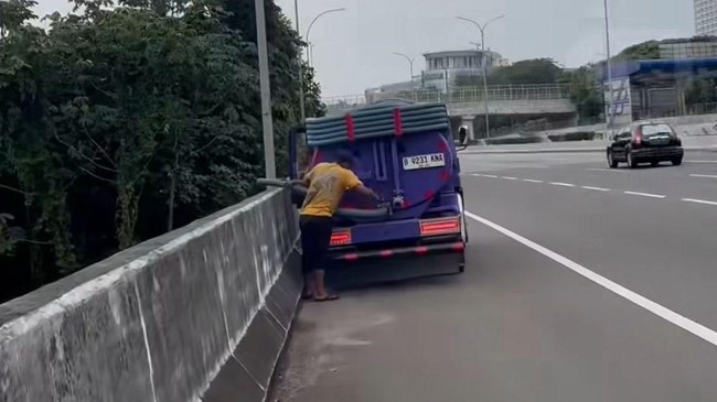 Rekaman video memperlihatkan truk yang membuang tinja ke Sungai Ciliwung, Depok, viral di media sosial. Truk itu membuang tinja dari atas jembatan Tol Cijago.